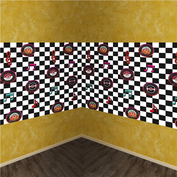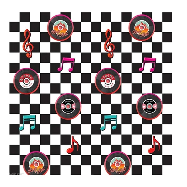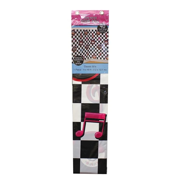 Set the scene for a 50’s style soiree with our Back to the 50’s rock and roll theme Scene Setter Backdrop. Our plastic room roll is 48″ x 40′ and is the perfect backdrop for your rock and roll theme party. Please order in increments of 1 folded room roll. Easily hang all of your Decorations with Sticky Tack, Item SUP010 or SUP017
