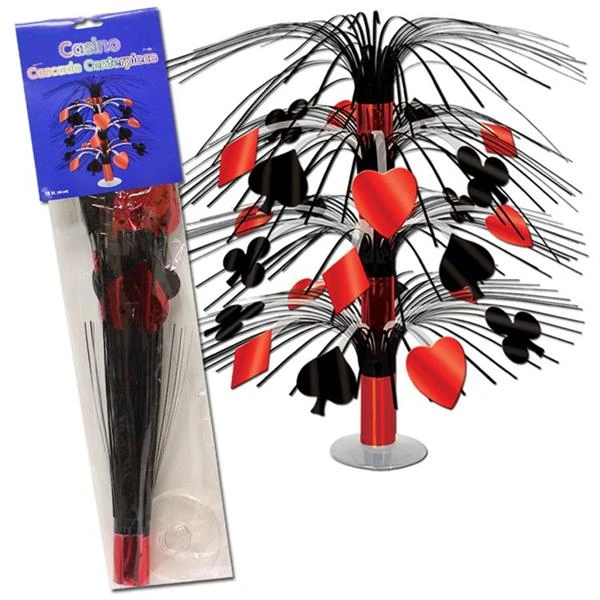 Top your party tables off with our metallic black and red Card Suit Cascade Centerpiece. This 18″ tall centerpiece looks great with all kinds of color schemes and is perfect for Casino, Vegas and Wonderland theme parties. Our Card Suit Cascade Centerpiece is priced per centerpiece. Please order in increments of 1 centerpiece.