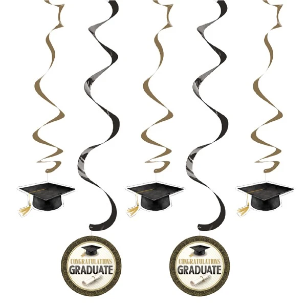Our hanging Classic Grad Whirls are the perfect decoration to hang over tables, in windows or doorways to celebrate your special grad at a milestone event. Each 5 pack featured 2r ound whirls with ‘Congratulations Graduate’ and 3 black grad cap whirls. Sold 5 to the pack. Please order in increments of 1 pack.