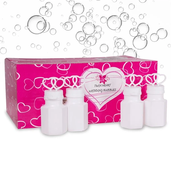 Blow bubbles do not throw rice. Pass out our 24-pack of Double Heart Bubble Bottles at weddings, showers, and fundraisers and of course Valentine’s Day. The top of each 0.6 oz. white bottle of bubbles features a plastic molded double heart. Sold in packs of 24. Please order in increments of 1 pack.