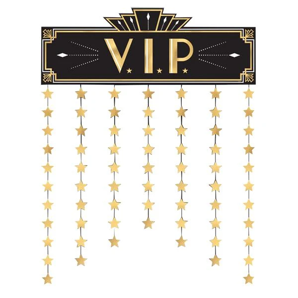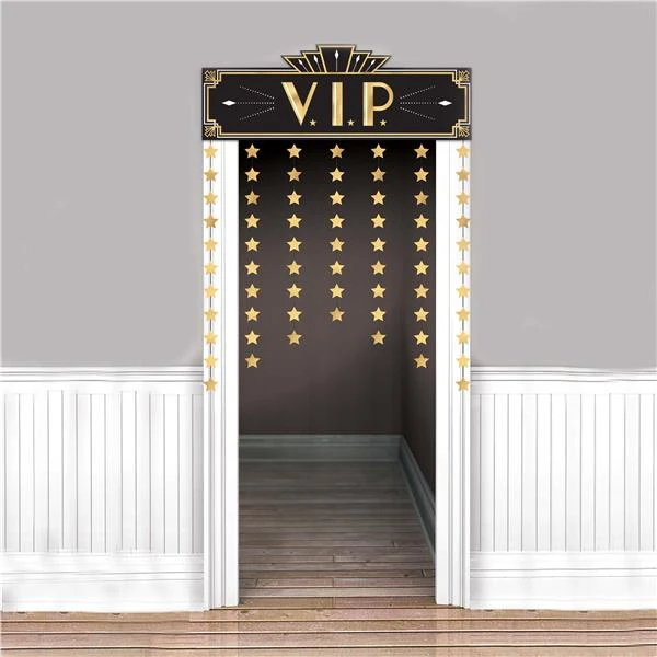 Welcome your guests to a VIP party with our Glitz & Glam VIP Door Curtain. Each door curtain features a lightweight cardboard topper measuring 13 1/2″ tall and 38 3/4″ wide. Easily attach to the door frame with sticky tack, items SUP017 and SUP010, or with our ceiling hooks, item DEC570075. Our black and gold Glitz & Glam VIP Door Curtain is accented with hanging gold foil stars. Mix and match with all of our black and gold, Glitz & Glam, Hollywood, and Roaring 20’s decorations and party supplies for the true VIP party.