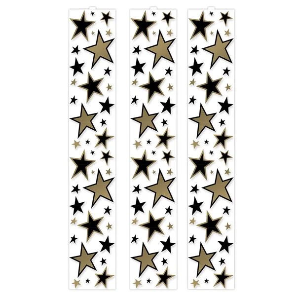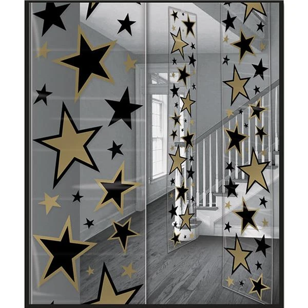 Add Gold and Black Star Panels to your next Gold themed, Award’s Night or New Year’s Eve event. Our Gold and Black Star Decoration Panels are each 12″ x 6′ clear plastic panels adorned with Gold and Black Stars and an attached loop for easy hanging. You can simply hang from ceilings or attach to, windows or doors with Sticky Tack, Items SUP010 or SUP017 or hang from ceilings with our ceiling hooks DEC570075UN for a magical and whimsical starry look.