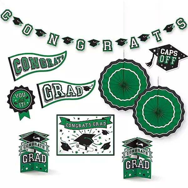 Go Green! When Green is your school color, green party supplies make a great choice for your Graduation Party. Our Graduation Green Room Decorating Kit includes: 1 – 10′ green graduation Banner, 2 – 12″ green fans, 5 – green graduation 10″-14″ cutouts., and 2-3D 10″ green centerpieces. Sold 10 pieces to the kit. Please order in increments of 1 Green Decoration kit.