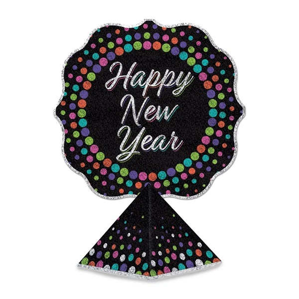 Decorate your table with a colorful glittered Happy New Year 3D Centerpiece. Each 12 1/2″ x 9″ centerpiece gives a dimensional look to your table decorations. Please order in increments of 1 centerpiece.