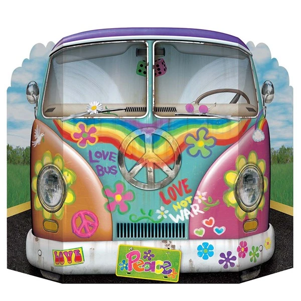 Remember the Volkswagon Love Bus in the 60’s? Want to take a ride on Filmore Street in San Francisco? Painted with slogans and peace signs. Add our tie dye cardboard Hippie Bus Photo Prop to your 60’s decorations and use as a photo op. Each cardboard Hippie Bus Prop is 37″ around by 25″ high and sold by the piece. Please order in increments of 1 piece.