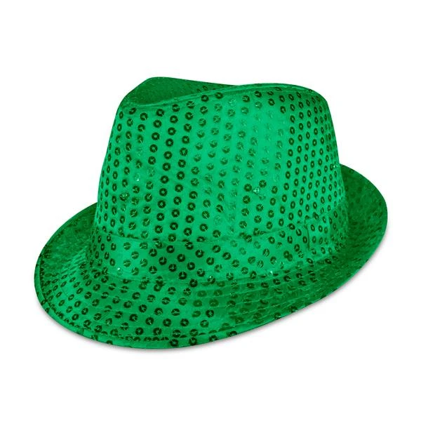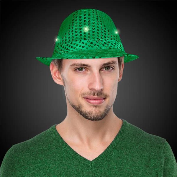 Go green the next time you want to add some fashion flair to your party attire with our Green LED Sequin Fedora! Whether you’re spicing up your St. Patty’s Day, Mardi Gras, or Christmas outfit, or just want to make sure everyone notices you, this green fedora is guaranteed to make you shine on any night! Our gorgeous dark green fedora features plenty of green sequins as well as 6 green LEDs that will make your fedora sparkle and shine all night long! Set the LEDs on your green fedora to one of three settings-slow blink, fast blink, or constant on-for a dazzling light show that’s sure to wow your friends! You can even incorporate this green sequin fedora into your holiday decorations if it’s a little too flashy for your fashion sense. Our green fedora comes with three AG13 batteries that are included and installed and can be replaced. One size fits most. Our Green LED Sequin Fedora is sold by the piece.