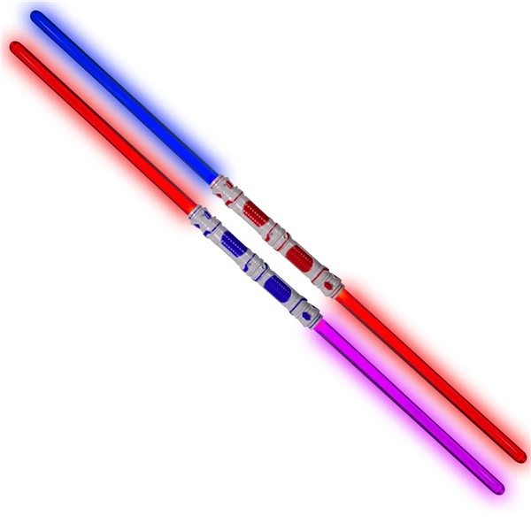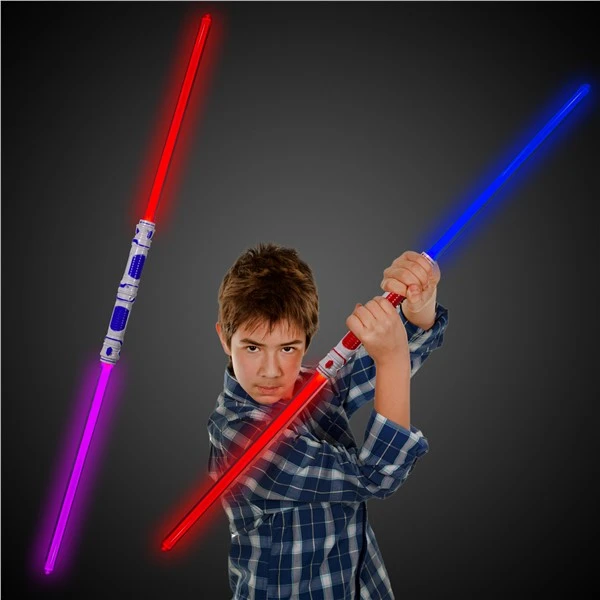 Get ready for the battle of lights with our awesome LED Dual Saber with cool space-age lights! Each light-up saber is approximately 21 1/2″ long. Combined with the dual saber measures about 43″long. Twist the ends of the light-up sabers to combine or split them into two sabers. One LED lightsaber features a blue LED light and the other lightsaber features a red LED light, both have steady light mode. When you press the on/off button prepare yourself for a futuristic power light worthy of a movie effect. The LED Dual Light Saber will light up and so will the cross near the base! As you power it off it gives you another movie-worthy powering light effect. Best of all the batteries are included, installed, and replaceable! Sold by the individual saber.