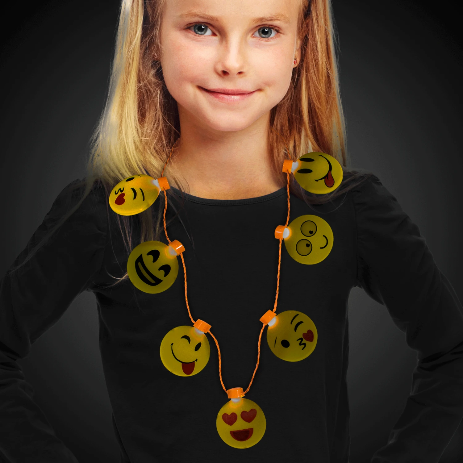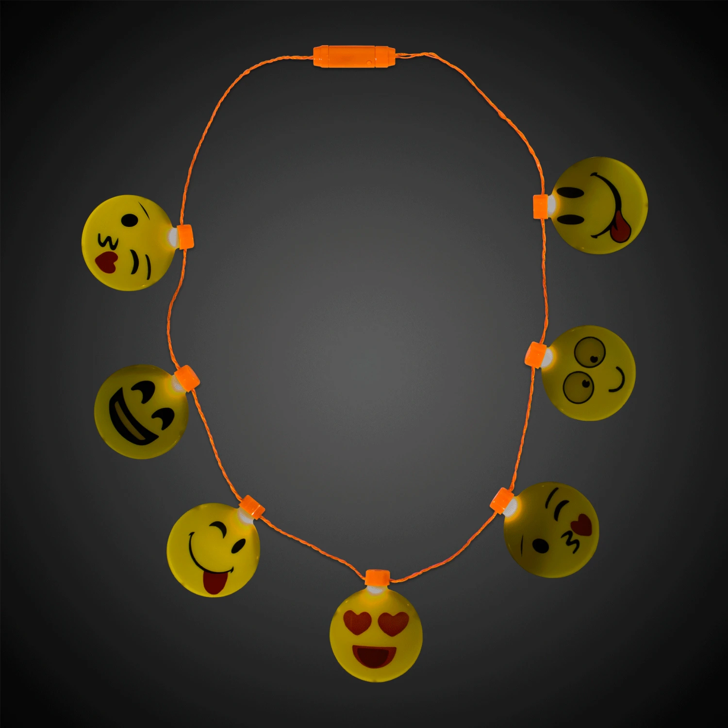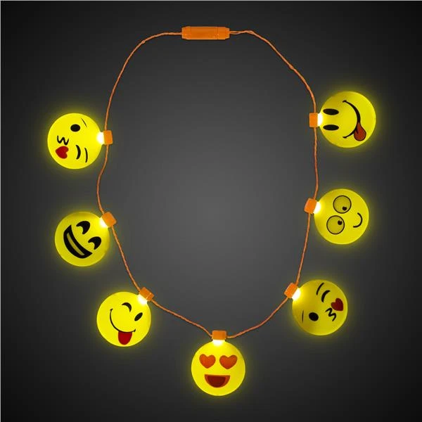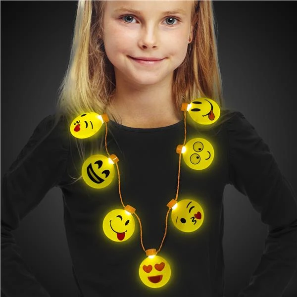 Our Light Up Emojicon Necklace is fun for all ages! Use this over sized light up necklace for any event with a pop culture theme. Emojicon theme parties are great for school age kids and even college students. Each Light Up Smiley Face Necklace features 7 emojicon character faces that are approximately 3″ tall and are illuminated by a bright white LED. Click the on/off button to choose from 3 different light settings; fast flash, slow flash and steady on. This fun light up necklace looks great at day or night events! 3 AG13 batteries included and installed. US Patent Number: 10,064,461