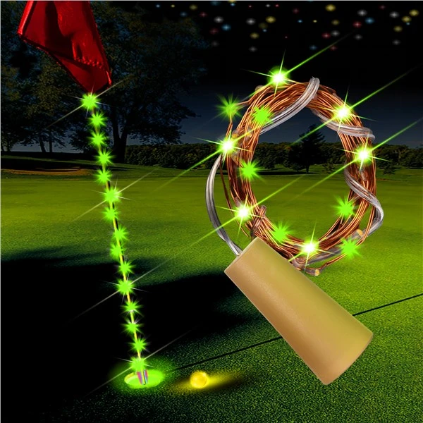 Light up the full length of your flag pole with our LED Flag Pin String Light and give greater visibility when playing Night Golf. The bright string light set comes with (9) 6’L LED string lights with (2) included & installed CR2032 batteries. PLEASE NOTE: Color received may vary based on current inventory.