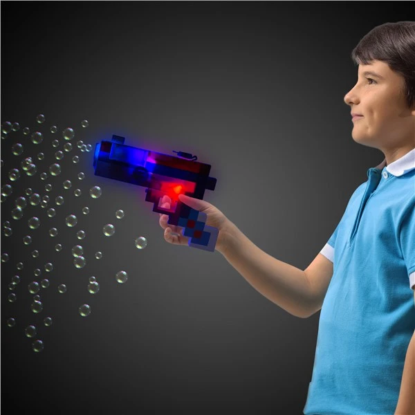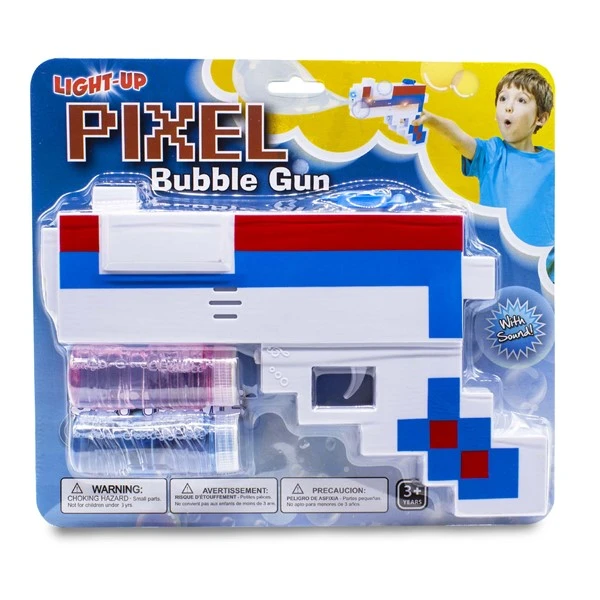 Our LED Patriotic Pixel Bubble Gun is bubblicious fun for all ages, especially kiddos. This red, white, and blue light-up toy bubble gun with sound requires (3) AA batteries, which are included & replaceable. Sold by the individual piece. Please order in increments of 1 bubble gun.