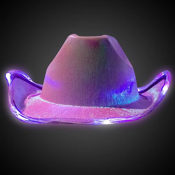 Any cowgirl will be happy to add this LED Purple Iridescent Cowboy Hat to her western outfit. Perfect for a gift or favor at Western theme parties, Bat Mitzvahs, Sweet 16’s &Â bridal events, and Mardi Gras. Each hat is accented with 8 LEDs around the brim to light the night. 3 AG13 batteries are included & installed. Sold by the individual hat. Please order in increments of 1 hat.