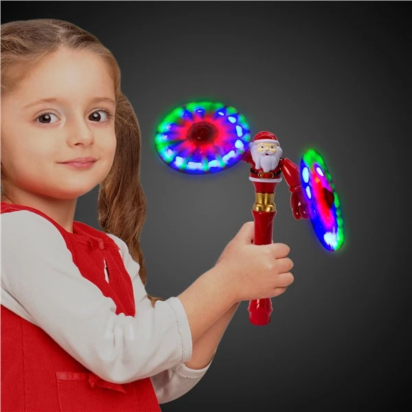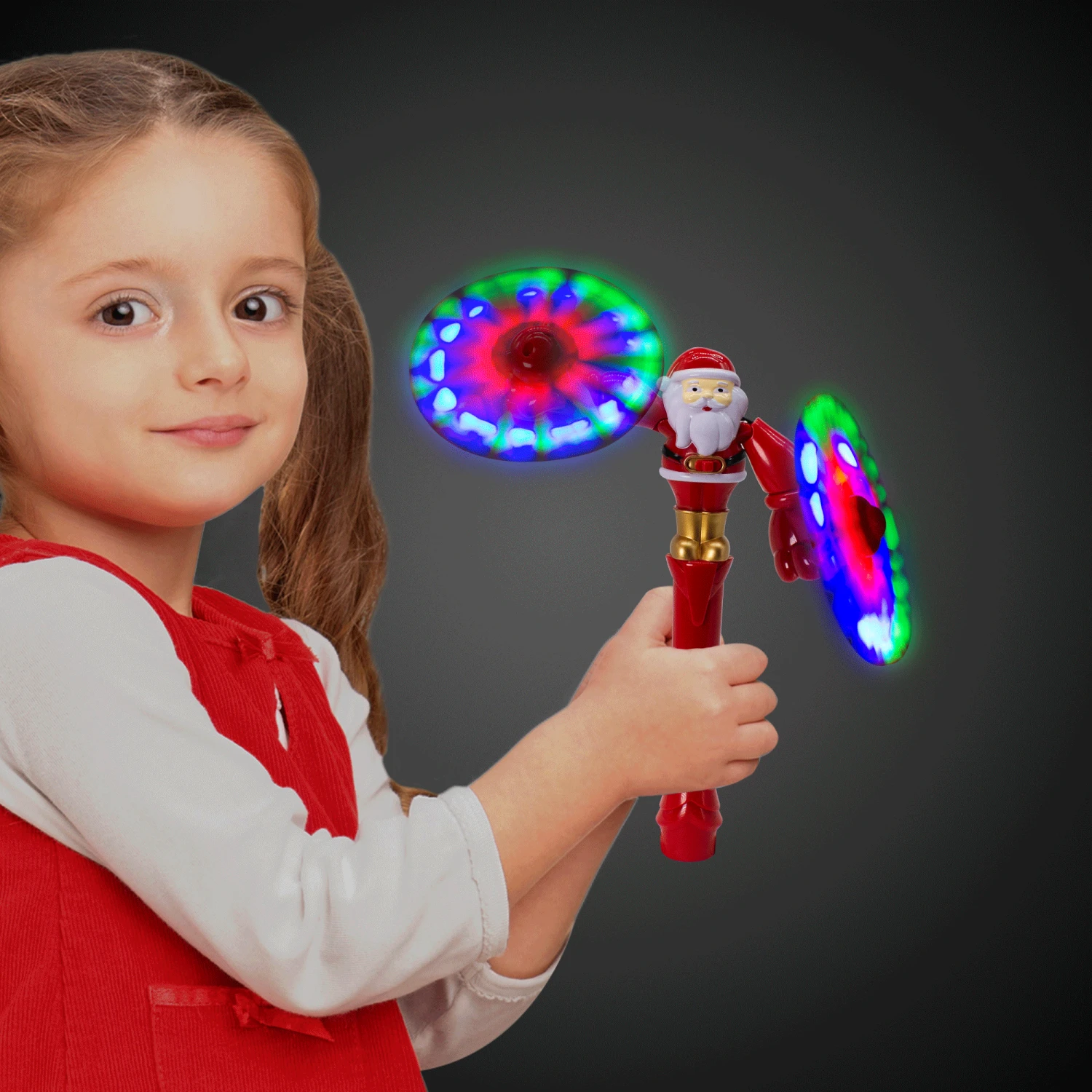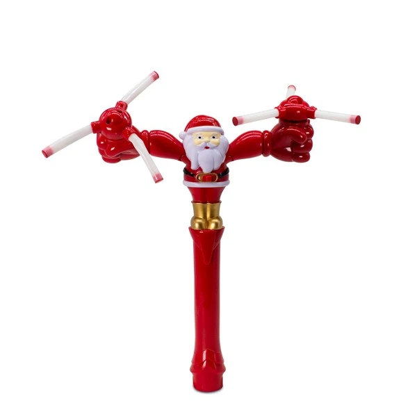 Our festive LED Santa Swivel Arms Spinner Wand is a hoot and makes a great Christmas stocking stuffer. This 10″H red wand toy features a very strong Santa in sassy gold boots standing atop a 6″ handle ready to wow you with his awesome arm action. Both arms adjust up & down at the shoulder joint, allowing Santa to stand tall in a ‘T’ formation, or have his hands at his sides like an upside-down ‘V’. Each of his giant hands holds a tri-color ‘windmill’ featuring (1) red, (1) green, and (1) blue LED that creates a mesmerizing circular light show when spinning round & round. Simply slide the red toggle switch left or right to turn on or off. (3) AA batteries are included, installed, and replaceable. Please order in increments of 1 wand.