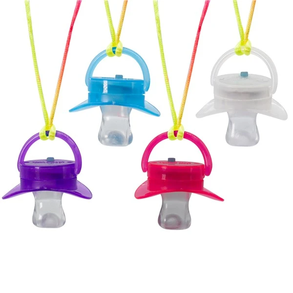 Our multi-color LED Toy Pacifiers are all the rage! These fun light-up toy pacifiers are great for raves, dance clubs, college parties, music festivals, and more. Also fun for baby showers, birthday parties, skating nights, family reunions, and nighttime vending. Each of our multi-color toy pacifiers features bright LEDs in multiple colors that, when activated by the on/off switch, will light up this toy pacifier in a fun flashing, blinking fashion that’s sure to be a hit at any nighttime event! Please note, our Multi-Color LED Toy Pacifiers have been tested and meet all criteria for a light-up child’s toy, however, is NOT intended for children under the age of 3 due to small parts. Our multi-color LED Toy Pacifiers are sold by the dozen in assorted colors and come individually packaged on individual blister packs. Please order in increments of 1 pack.