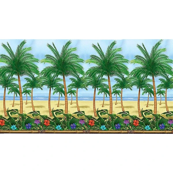 Mix & match all of our plastic luau scene setter decorations and set the scene for a terrific Hawaiian party. Our 48″ tall by 40′ long heavy plastic palm tree beach island scene setter roll is a great way to start your tropical decorations. Easily and safely attach all scene setter decorations with sticky tack, item SUP017, to walls or fences. Each 40′ long roll is folded in an individually polybag and is sold by the piece Please order in increments of 1 scene setter.
