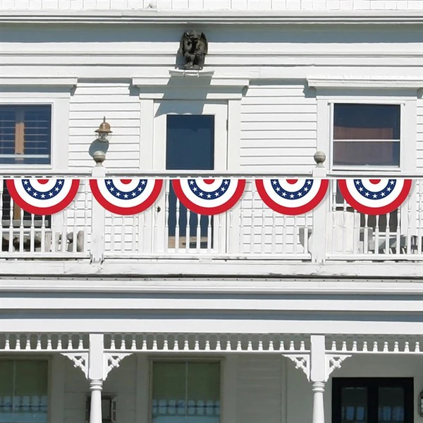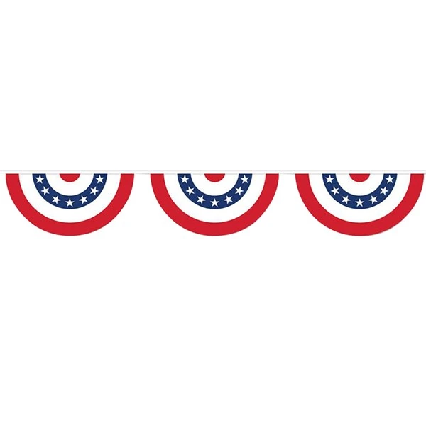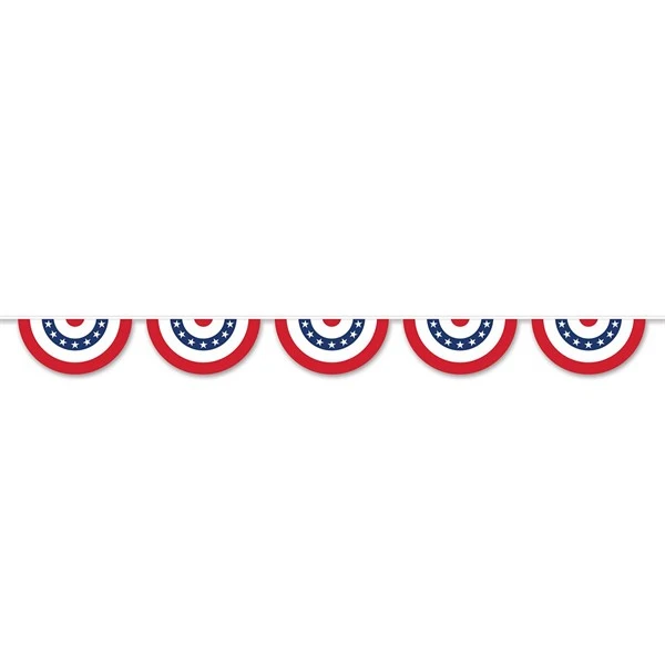 Decorate in red, white, and blue for Memorial Day, the 4th of July, Election events, or anytime you are having an American or patriotic event. Our 11″ x 144″ Patriotic Bunting Banner features 5Â scallops and is perfect for indoor or outdoor events. Mix & match with all your Americana decorations. Our 12′ long banner is perfect for porches, railings, and wall decor. Sold by the individual banner. Please order in increments of 1 banner.Â