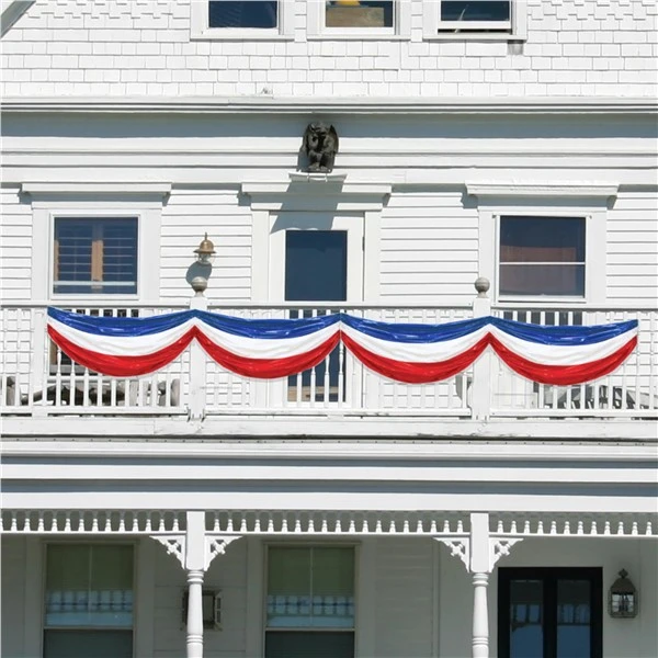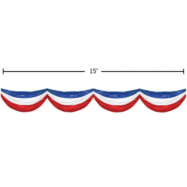 Show your patriotic spirit and decorate with our 15′ long red, white, and blue Patriotic Plastic Bunting. Each 4-scallop 3′ x 15′ plastic bunting decoration is a great choice for national holidays like Memorial Day & the Fourth of July, homecomings, election events, Olympics, or any patriotic day. Our red, white and blue plastic bunting can be used inside or out and is sold by the individual bunting. Please order in increments of one bunting.