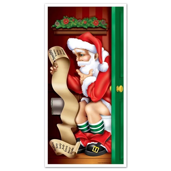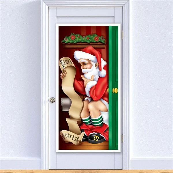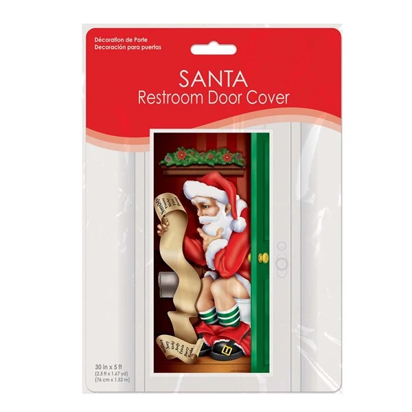Santa is always paying attention to who is naughty or nice! Add a touch of silliness to your Christmas party and let everyone know where the restroom is when you decorate with our Santa Restroom Door Cover. This clever way to decorate your bathroom door features a fun illustration of Santa working hard! Our plastic Christmas Bathroom Door Decoration is 30″ x 5′ and can easily be attached to walls with Sticky Tack, Items SUP010 or SUP017. Printed on one side only.