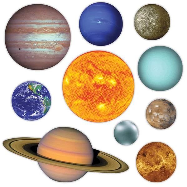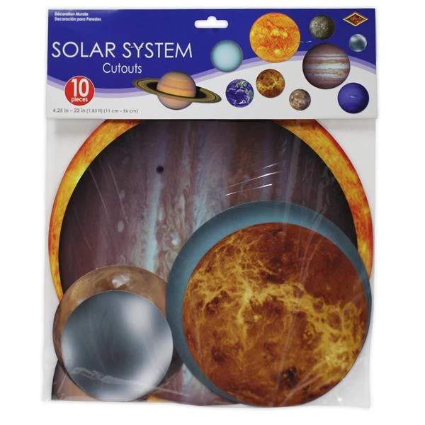 Add the solar system to your outer space decorations! Our solar system cutout group comes with 10 planets in assorted sizes ranging from 4 1/4″ to 22″. Each planet cut out is made out of lightweight cardboard and includes; the Sun, Jupiter, Saturn, Earth, Pluto, Mars, Uranus, Mercury, Venus, and Neptune. Sold in a pack of 10 cutouts. Please order in increments of 1 pack.